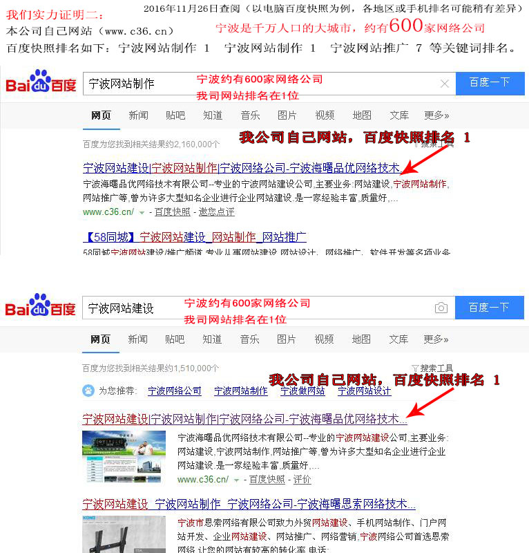 2、浙江省寧波市是千萬(wàn)人口的大城市,約有600家網(wǎng)絡(luò)公司,競(jìng)爭(zhēng)異常厲害,“寧波網(wǎng)站建設(shè)”“寧波網(wǎng)站制作”這二個(gè)關(guān)鍵詞,本公司網(wǎng)站多年來(lái)基本上百度快照排在 1名(360搜索也排名在1名)